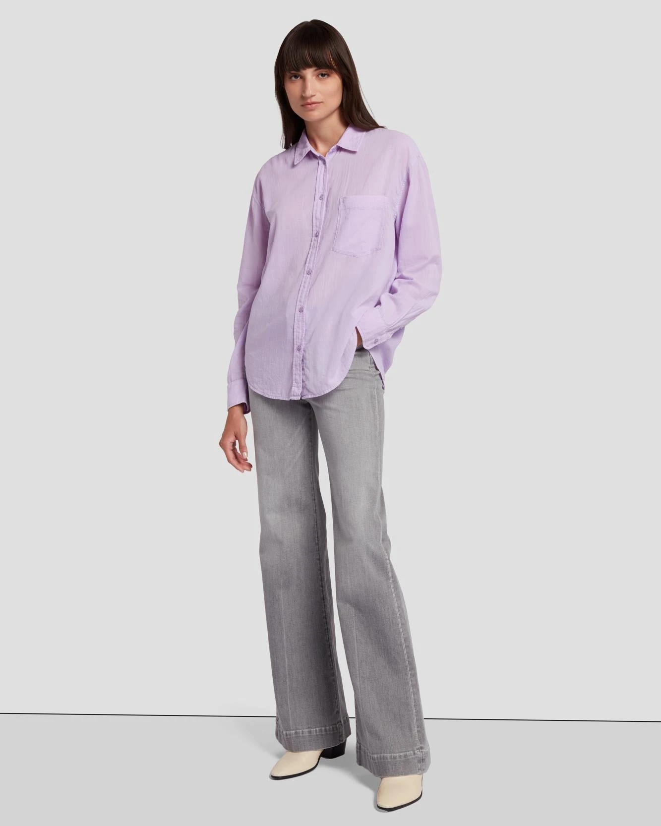Your favorite button-up gets a delicate, pastel update. This shirt offers a feminine take on a closet staple, and comes in a slightly sheer lavender shade for the perfect flush of color.