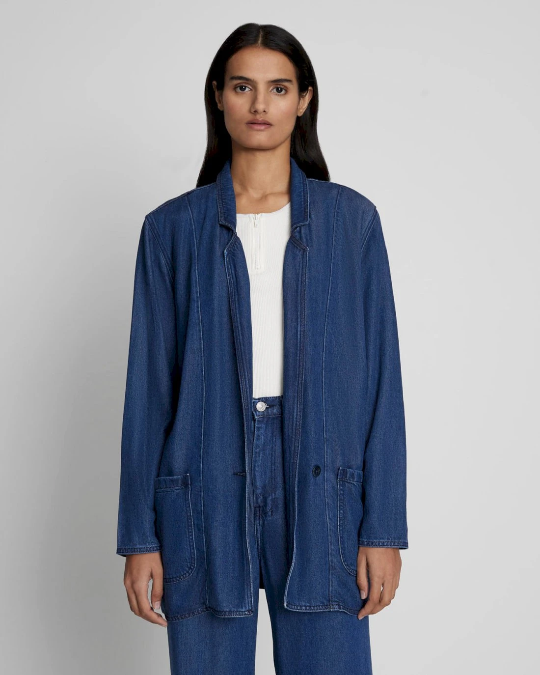 Our Denim Lustre collection is crafted from biodegradable and compostable fabrics for breathable long-lasting comfort and a super-soft hand feel. This unstructured blazer was designed with everyday practicality in mind. Easy to scrunch sleeves, oversized fit, and a single-breasted center front button so you can wear it open or closed. It’s the perfect piece for transitional weather and travel.