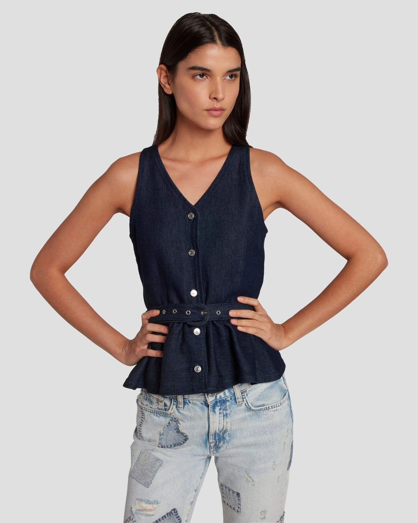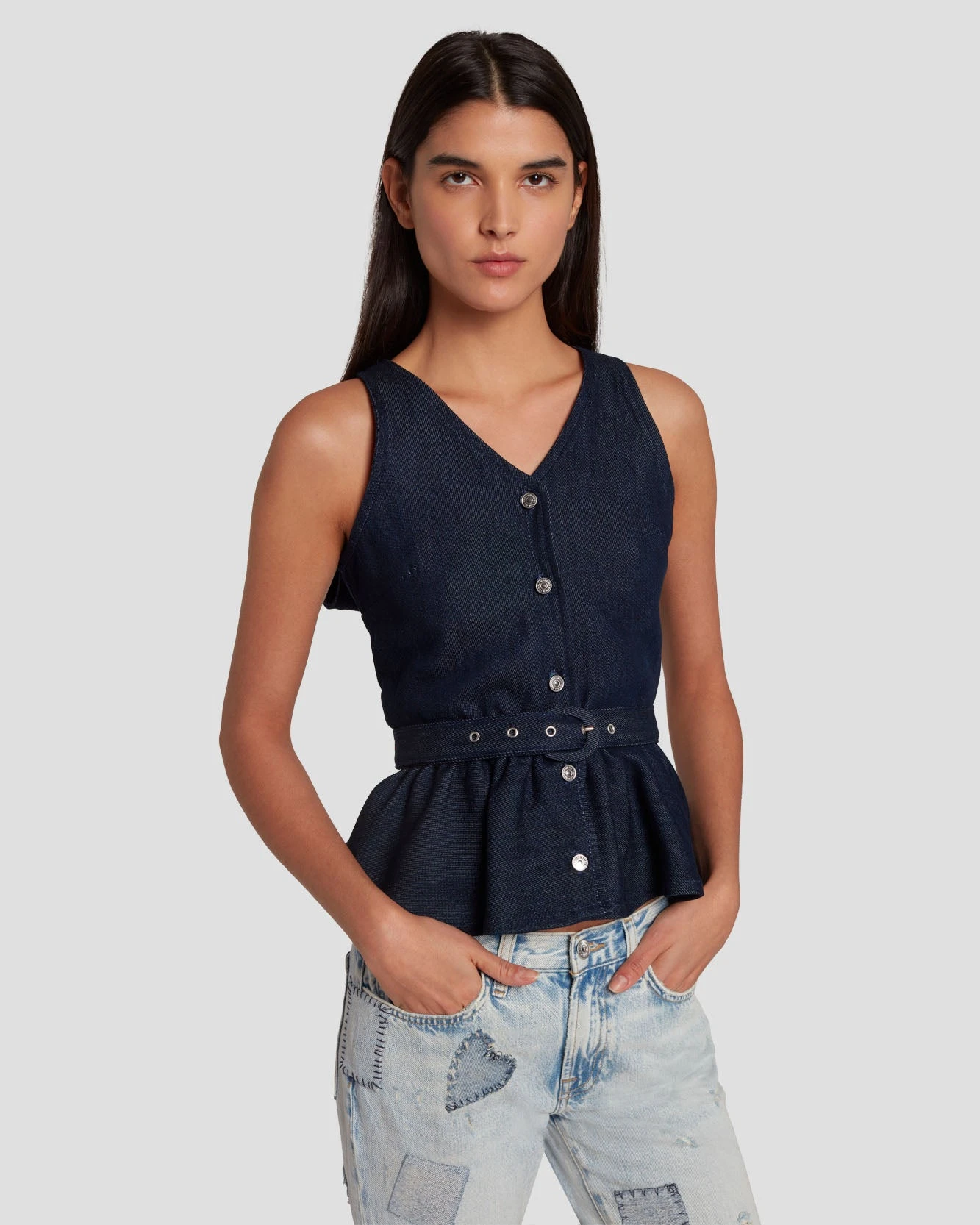 Our Denim Lustre collection is crafted from biodegradable and compostable fabrics for breathable long-lasting comfort and a super-soft hand feel. This vest is a sleeveless, belted top that features front button details and a peplum silhouette for added style. Pair this denim top with your favorite jeans for an effortless look.