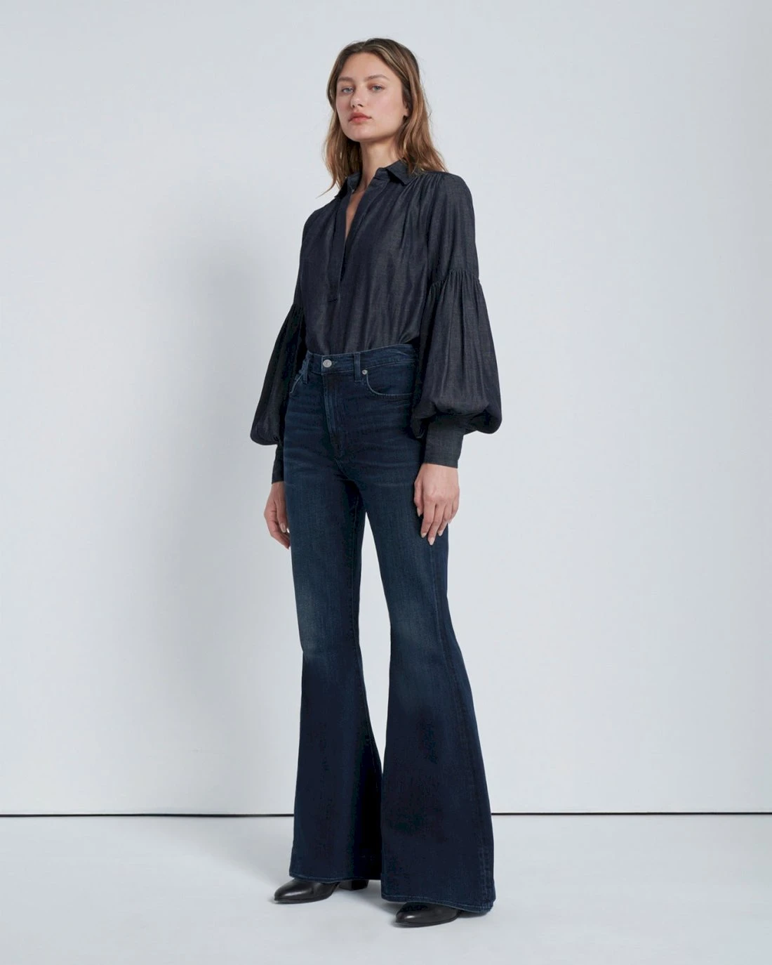 Our ultra high-rise fashion jean makes an impression. With its 70s-inspired silhouette and medium stretch fabrication, this showstopper is done in an elevated dark wash with whiskering. Fitted through the hips and thighs, its elongating leg leads to a bold flare.