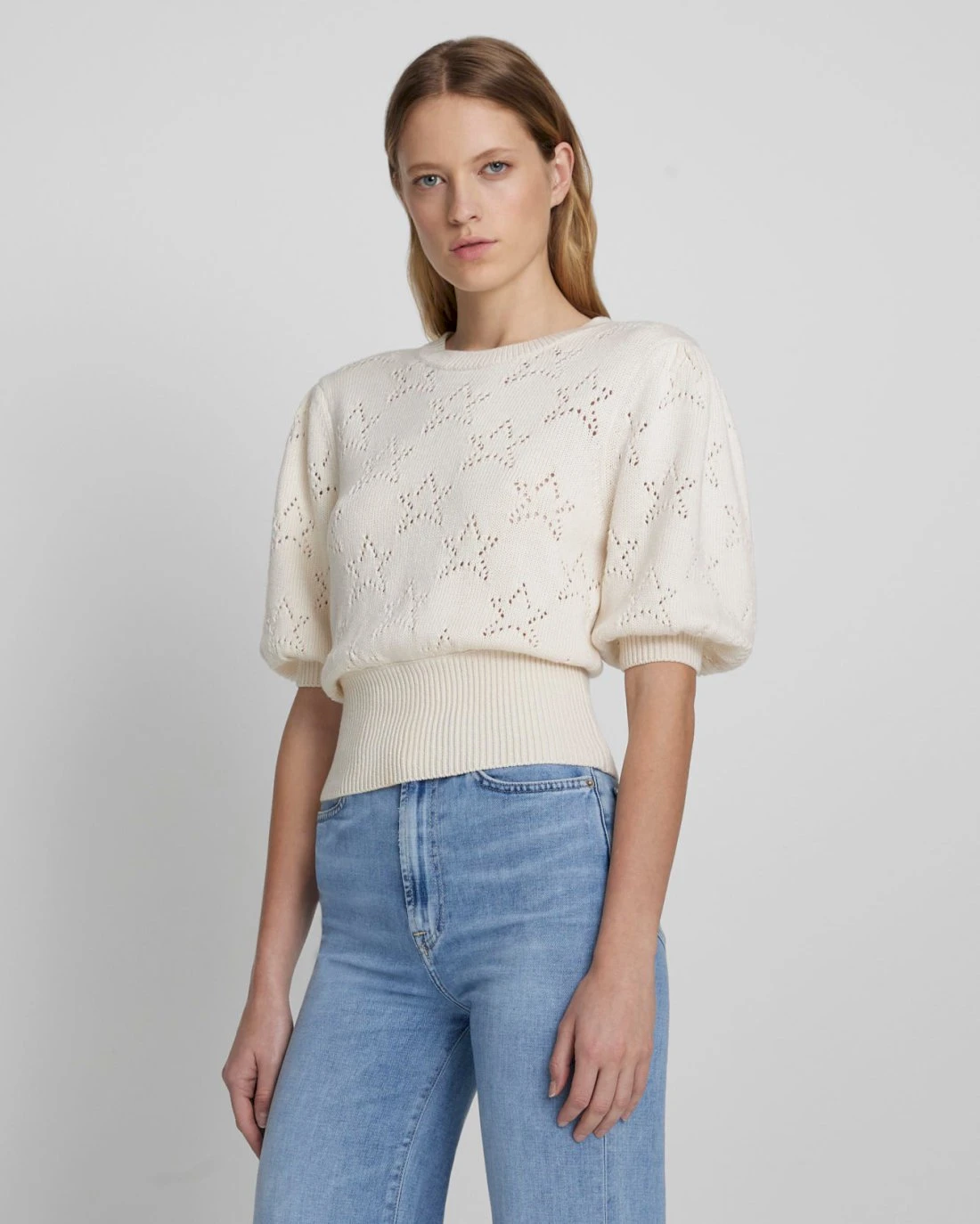 7 For All Mankind Puff Sleeve Pointelle Sweater In Antique White Star