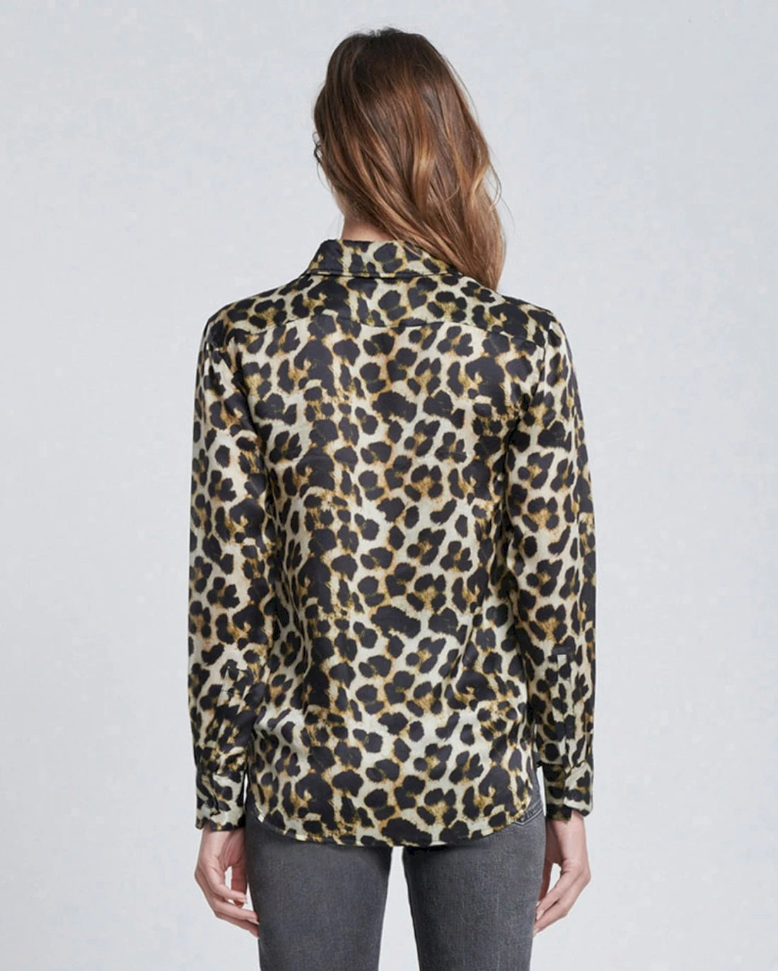 A little bit feminine, a whole lot of attitude. Made from 100% silk, a high-shine blouse is crafted with a tailored finish in a confident leopard print. Soft feel, collared, front buttons, button cuffs. An opulent essential that pairs with your favorite denim.
