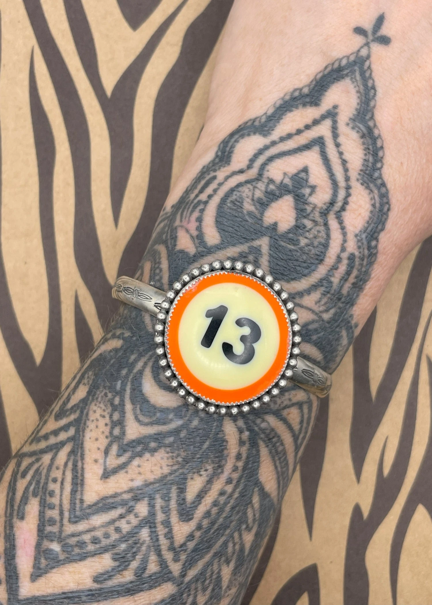 Handmade in California by Bog-Art-Studio, this one-of-a-kind cuff bracelet features a #13 billiard ball set in a sterling silver bezel with intricate deco wire detailing. Its bold orange design symbolizes skill, precision, and transformation, making it a statement piece for pool enthusiasts and those who embrace individuality.Â