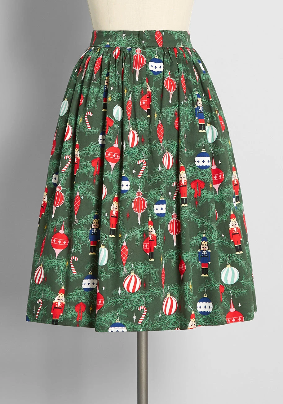In a rich forest green, this swing skirt from UK brand Collectif channels holiday nostalgia with a retro-fab print of Christmas tree branches adorned with various ornaments, candy canes, and toy soldier figurines in shades of red, white, and blue. Made from a stretchy weave, this high-waisted A-line skirt boasts handy side pockets and a vintage-inspired swing silhouette that is perfect for you to twirl throughout the holidays. Pair it with the Christmas Tree Dreams Top to complete the ensemble!